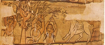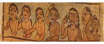 Main themes of Santhal paintings spread over rituals and celebrations such as dance, harvest, merry making, family functions and of course many Hindu deities too. The scrolls illustrate mythological stories in Bengali version of the epics, Ranayana, Mahabharata and secular narratives of social, political or historical interest. They go village to village inhabited by Santhal with pictures on long scroll of paper, painted now days with bazaar colours. They sell their pats at village fairs and entertain the rural audience with their jarrono pats by showing these paintings and tell stories. A part from popular mythological stories, the themes sometimes, is a condemnation of social injustice, ending with a pasteurization of hell and of the evil – does being tortured in retribution. The picturing on the scroll are arranged in rectangular panels, one below.