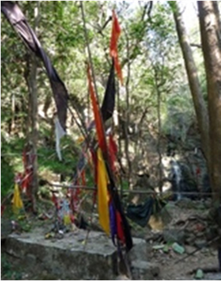 To reach the shelter one must first drive north from Borī, cross the Borī River and stop half an hour later in the jungle. Then a short hike will take one to a jungle sanctuary, near a waterfall, devoted to Goddess Kālī and to God Mahceo (Śiva). The sanctuary is obviously in frequent use as we can tell from colourful flags, tridents, stones painted with vermillion and offerings of all kinds (Pl. 2.1). The steep climb to Belkandhar 1 starts right from behind the sanctuary. It takes about one hour to reach the shelter.