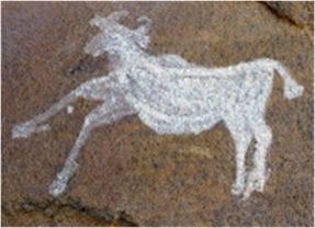 Neolithic/Chalcolithic (± 2500 BCE to 300 CE) deer, bison and humped bulls appear. The bodies of animals are sometimes decorated with lines or may be in flat tint. Humans are more naturalistic. The colours used are white and, sometimes, yellow; red is rare.
