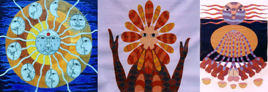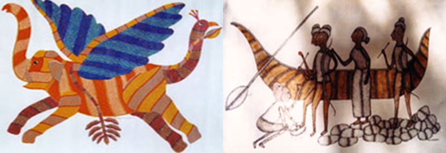 Gond paintings have simplicity innocence and charm. They provide a unique opportunity to see how people living in isolation relate to the world around them – to people, animals, gods, demons and other elements. Gond of Madhya Pradesh use dots extensively on the body of gods, and animals indicating movement and validity. Muria tribes uses dots and snall lines. Sometimes even without a solid line they use small lines to outline the figure to create the sense of vitality and action.