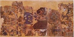 Painting in Rajasthan developed in three phases. The parent style was that of the illuminated Jain manuscripts of the 14th c. from Gujarat. The local genius of Rajasthan developed when Mughal school of painting came into contact with parent Gujarati style at the end of the 16th c. Rajasthan art was pictorial analogue of the contemporary ‘brajabhasa’ poetry with its fervent devotion for Krishna.