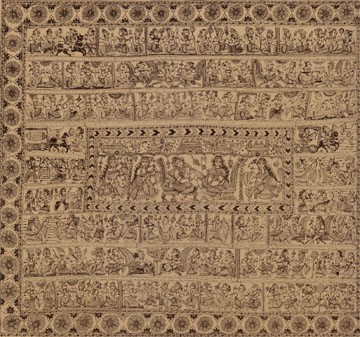 The tradition of Kalamkari painting is very old. In India many arts and crafts were nurtured in the temples. The temples were a major inspiration for dedicated artistic endeavor. The traditions of all the arts in south India had their roots in temple rituals. Srikalahasti near the temple town of Tirupati, is an ancient center of the devotional aspect of this craft which developed around places of pilgrimage. The function of temple cloth painting is narrative, their themes drawn from the rich mythology of Hinduism. The craftsmen of the pen and brush technique painted in narratives the religious legends from which people learnt the stories of their gods – a tradition which continues even today in many parts of India.