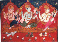 Nathdwara is a small pilgrimage town in Udaipur district, Rajasthan . The word Nathdwara means gateway to the Lord. Nathdwara has been the head quarters of the chief deity of the Pushtimarga sect, founded by Sri Vallabhacharya in the sixteeth century. In Nathdwara , art is the occupational heritage of the whole joint family. There are two different painter sub castes , the Jangira Brahmins and the Adi Gour Brahmins. Painters from many places migrated to the site in hopes of royal and religious patronage.
