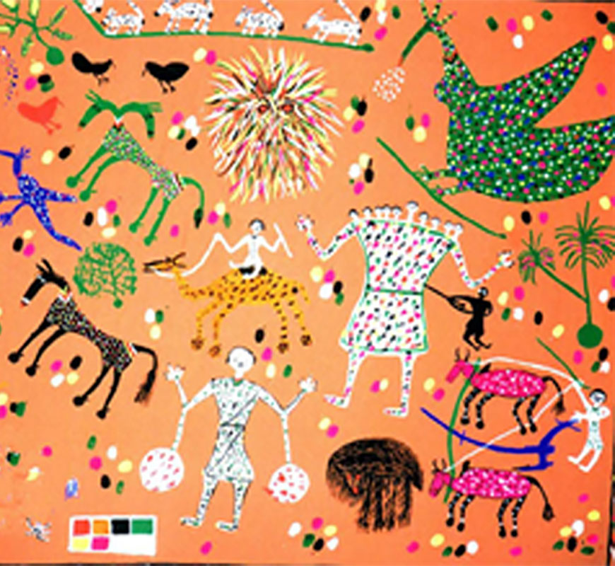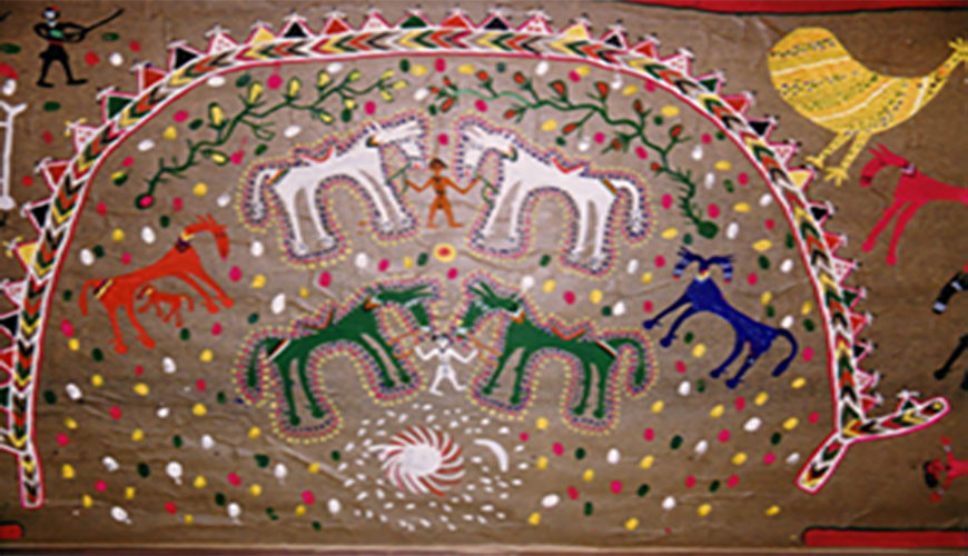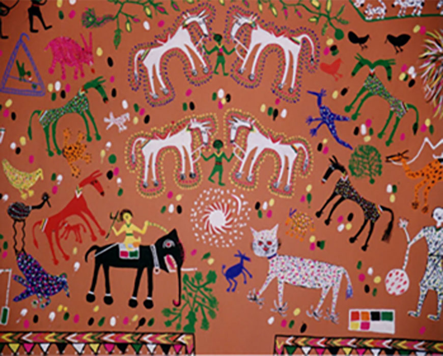 Among the Bhils of Jhabua, Pithora painting is a ritual held in great esteem. Pithora horses are painted by the lekhindra, the traditional painter, and offered to the devas. As the story goes, in the kingdom of Dharmi Raja, people had forgotten how to laugh or sing and dance. Pithora, the prince, then undertakes a journey on horseback to the abode of the goddess Himali Harda, who gives them back their laughter, songs and dance