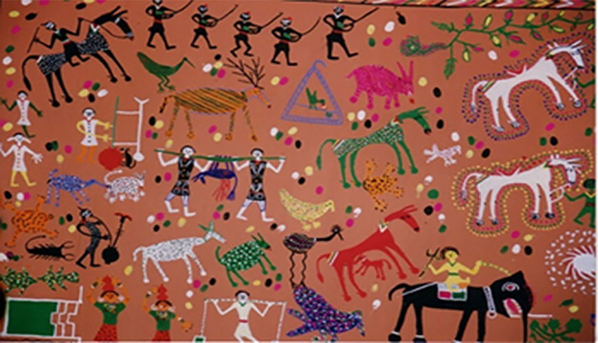 The Bhils and Bhilalas of Dar and Jhabua in Madhya Pradesh and Rathwas of Punchmahal in Baroda district of Gujarat display characteristic ritual wall paintings created by traditional caste groups known as Lakhindra. Madhya Pradesh and Gujarat worship wedding deity “Pithora” whose images are painted on house wall on the occasions such as weddings.